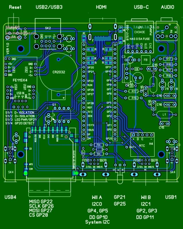 A Pico, Not A Wii Just for fun. No apologies, this is only intended for gaming. :) This isn't a completed design, obviously, but it brings together some ideas I've intended to try. Uses the new 44-pin version of the Pico 2. :) Add 2 extra pins on each side to connect D+, D- and GP25. You can restore it to normal later by taking your link wires to the TPs off and snapping off the extra pins. The WII sockets support the DD pins so detect them going high to see if a controller is plugged in. (I need external pull down resistors, forgot - sorry). Uses a 4-way DIL switch. 1 & 2 isolate D+ and D- while installing MMBasic. 3 overrides the GP21 signal to the LED, making it indicate Power On. 4 pulls GP20 low. It could be used to, for example, instruct an auto-run program to abort while testing it. There must be other uses. :) If switch 3 is off you have full control over the LED. The Red side is fed from GP25 and replaces the heartbeat. The other side is fed from GP21. You can PWM these or whatever. I have some Red/Blue LEDs now which are rather nice. :) The WII connectors are a little close together really, but just about manageable, I think. I can't get them any further apart without having to use a micro SD socket. You don't escape SMD soldering anyway as the HDMI socket is SMD as are its 0805 resistors. Mick Zilog Inside! nascom.info for Nascom & Gemini Preliminary MMBasic docs & my PCB designs |