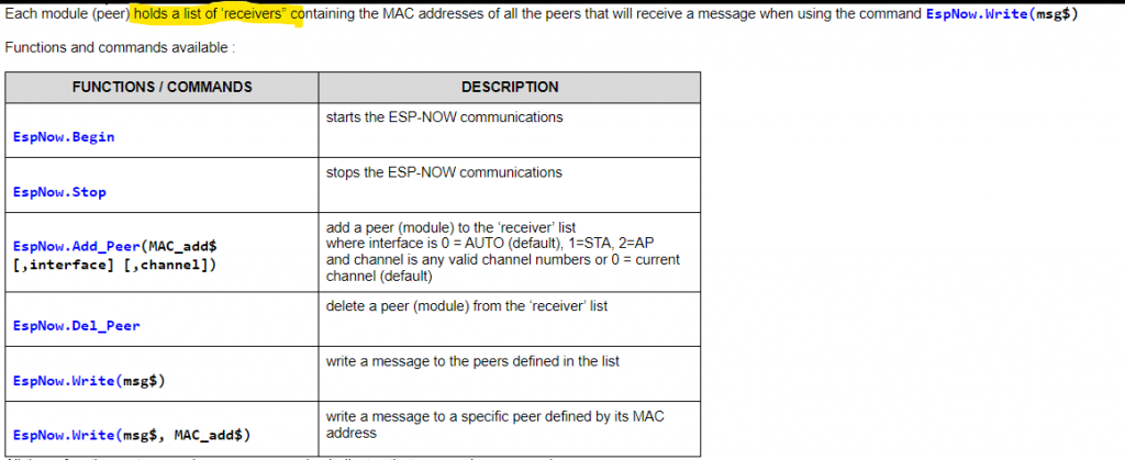 ESP8266, ESP01, ESP32, ESP32-C3, ESP32-S2, ESP32-S3 with Annex Basic all have ESP-NOW support. Jan. Edited 2024-11-07 07:52 by JanVolk |