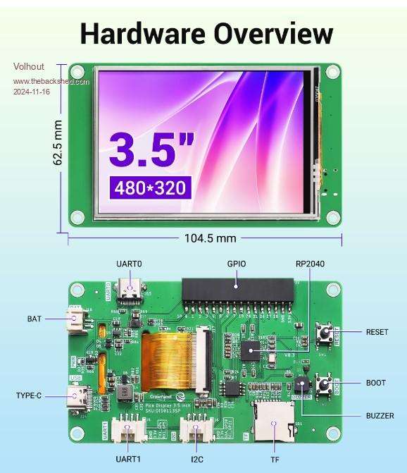 Hi, Stumbled upon this. At a good price. CrowPanel It could potentially run MMBasic. Has Pico on board, LCD, SD card slot, battery charger, USB UART interface, as well as USB power. As small PCB with buttons and speaker would make it into a Game*Mite. ![]() I think 15 dollar is a good price. Volhout PicomiteVGA PETSCII ROBOTS |