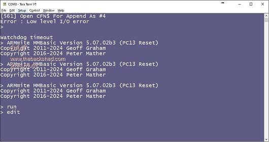 I have looked at the code but have not seen anything that might cause it. I have made some changes that may help narrow it down or may even fix it if its due to a spurious MMBasic reset. (Which is the only think I can see which would clear the Program Memory and leave the firmware intact.) PC13 was implicated with the SDCard in the past so maybe something is triggered when writing your log file. There are two things in the firmware. 1. An MMBasic Reset will report itself on the console at the restart after the reset so you know it has happened. 2. An MMBasic Reset will only be triggered during a Power Restart. Once MMBasic is running it will not trigger an MMBasic Reset no matter what conditions are placed on PC13. This firmware requires a GND on PC13 to trigger the MMBasic Reset as before. 3.3V on PC13 will trigger a switch to the serial console, again only at a Power Restart. The startup banner at an MMBasic Reset. > ARMmite MMBasic Version 5.07.02b4 (PC13 Reset) Copyright 2011-2025 Geoff Graham Copyright 2016-2025 Peter Mather !!! MMBasic Reset !!! A little test program to show it can't be killed once it starts.??? Print "Program Available" WatchDog 2000 Do Pause 3000 Loop SUB mm.startup Option autorun ON End Sub The firmware ArmmiteF407PC13Reset.zip F4 H7FotSF4xGT |