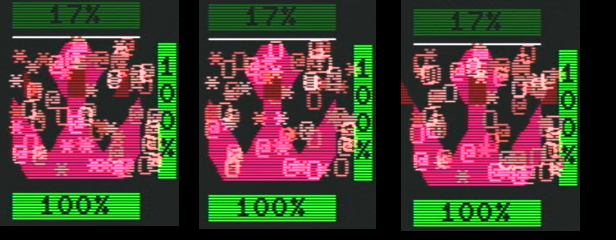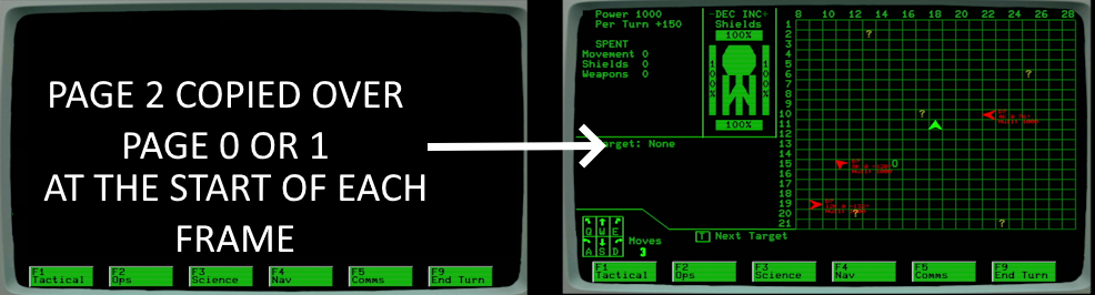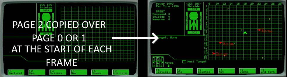 Dev update: My current problem is that the screen redraw is very slow, taking about 250 milliseconds to redraw the full screen. Normally this wouldn't be much of an issue for a turn based game (the screen isn't being redrawn 99% of the time), but I want to improve it for two reasons. 1. When the player moves their ship, there is a 250ms lag between the keypress and the ship moving. I know that sounds small, but it is noticeable and makes the whole program feel sluggish. 2. I want to do some fairly high speed animations (explosions, warp etc.). And 4 frames per second just isn't going to cut it. On that note - one of the things I'm trying to achieve with the retro-ASCII graphics, is to lull the player into buying into the old VT terminal interface, and then when something spectacular happens, an ASCII ship explosion for example, it has far more impact. If you ever watch the movie Galaxy Quest, it uses this downplaying method to great effect. The first part of the show, when they are on the TV show is shot in 4:3 ratio. You don't really notice it. Then it opens up to slightly widescreen when they are out of the show and in the real world. But when Tim Allen's character first sees the hanger doors of the space ship open to the void of space, the image matches the doors opening to expand to full widescreen. That's the kind of wow factor I want recreate - where we're showing people what looks to be a text based display - but is in fact a fully bitmapped display. Of course, I could just go straight to using 65K colour graphics, but that would ruin the effect. I have to walk the fine line between this being a retro-text terminal display… but also able to do some cool things with those text characters. Before I dive into specifics of my speed issue, I figure that some very basic knowledge might help if you're new to the CMM2/games programming. Therefore, I'm going to give a quick overview as to how the graphics are organised. If you're familiar with double-buffering and blitting, then you can safely skip this post and go on to the next one. You won't be missing out on anything. We're using Mode 1 - 16 bits for the graphics. That is 800x600 pixels with 65,000 colours. Because we are using a font that is 10x20 pixels, this gives us about 80 columns of text across the screen and 30 lines. It's slightly less because of the Bezel image I'm using around the outside to make it look retro. The 1st Generation CMM2 can store 3 of these Mode 1 graphics pages in memory (numbered 0, 1 & 2). I could increase this to 6 pages by dropping down to 8-bit/256 colour mode - but I really like the bezel (which doesn't look as good in 8 bit mode), and because we are using fonts instead of bitmapped graphics, we don't really need the extra pages. We can think of these three pages of video memory as three blank sheets of paper. We can show any of them to the user at any time. If we were just to use page 0, then we would be using one sheet of paper - drawing each frame, then erasing it, then drawing the next frame over the top of it. Unfortunately, the user would see the page being cleared for a split second before everything is redrawn, and this would be an annoying flicker on the screen with each redraw. So, to get rid of this flicker, we alternate between drawing on pages 0 and 1, and we show the user the other page. So, if I want to refresh the image on the screen, I show the user page 1, and I draw on page 0. When I have finished drawing, I swap the sheets of paper over and show the user page 0 and clear page 1 ready for the next image. We keep swapping back and forth like this and the user sees a seamless animation with no flicker. The call to change which page the user can see is almost instantaneous - so you can achieve very high frame rates with this method. This is very common in games programming and is called double-buffering and is critical in action games where sprites are moving around the screen many times per second. Next, I'm going to mention Blitting a lot. Blitting is simply the method used to copy one piece of graphics memory to another. So, I could have an image of a space ship on graphics page 2 at position 0,0 with a width and height of 50 pixels. I can "blit" that rectangular image very quickly from page 2 onto any location on the draw screen. The original copy stays on page 2, but by doing this I can quickly "draw" multiple graphical elements on my screen. So, for something like space invaders for example, we would have one image for the space invader on page 2, but we would copy it 20 or 30 times on to the draw screen to build up the image of a swarm of separate invaders. A typical sprite sheet is shown below. By blitting portions of it on to the game screen we can quickly build up quite a complex image. The final thing to know about blitting is that it's very quick if you're overwriting the entire rectangle. However if you want to blit a rectangle with a transparency (for example, a player sprite walking in front of a building), then one of the colours (black) will be designated as "transparent" and will not be copied over to the new image. In the images below, you can see what would happen if we didn't use transparency (left image) when the player character starts to erase the door image. So we would draw the player character with transparency, so that we can do not destroy the image behind the player sprite. The only thing you need to know about this is that transparency does slow down the draw speed a little bit. That's it - you're now up to speed on everything you need to know to understand my next post. |