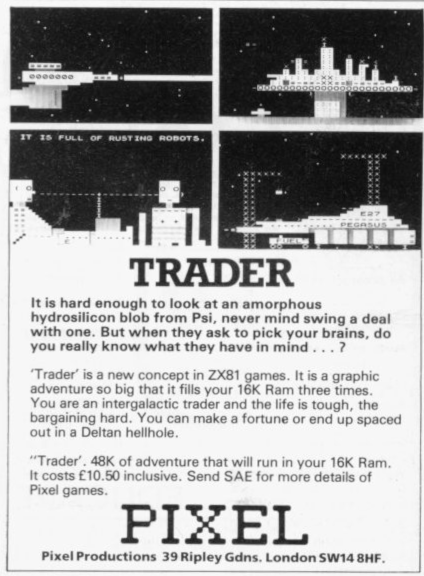I can't keep calling this game 'Not Star Trek' - I need to come up with a working title for it. Star Trek, Star Wars, Star Raiders, Star Citizen, Star Lord - I should follow this theme and start with the word Star. Then there's the thought that I could do a pun on Star Trek and have Star Walker…. Wait that sounds a bit too familiar. I could put it up for the popular vote - but then I would end up with Starry-McStarface. I could go for Stargasm - but don't really want to explain to my kids that the game I'm working on is called that. Way back in '81 I used to look at adverts like the one below - and drool over what I thought was a fully fleshed out space sandbox. Experience (or cynicism) has taught me that these were possibly the only graphics in the game, but I quite like the idea that my game would be a spiritual successor to this sort of game. So Star Trader it is. |
