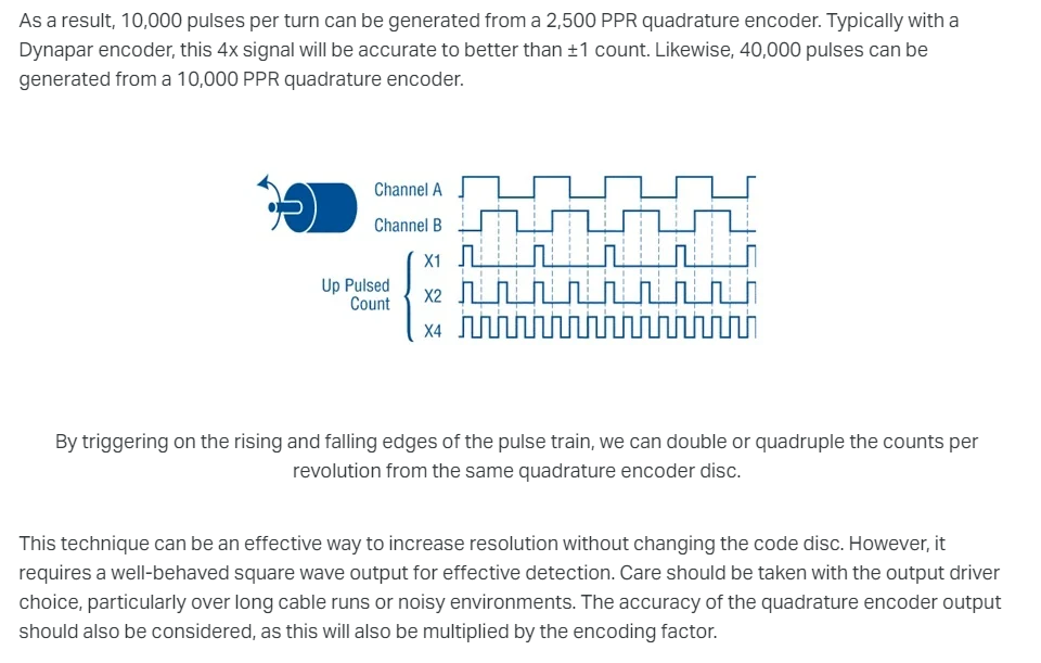 Yeah, like a robot joint (axis) or a CNC machine motor. We keep a track of the shaft (rotor) angle. Many of my encoders are 4,096 "line" but in order to also detect direction, there are two (5v) pulse streams that are 90° out of phase. Due to the fact that we then have two rising edges and two falling edges, we have 4 separate transitions. This is where "quadrature" comes from. a 4,096 line encoder now provides 16,384 counts/rev. Some of my motors run at 6,000 RPM (100 revs/sec) so the PicoMite will need to handle 1.6M+ counts/sec. Granted, it would take a while to hit +/- 31bits but I don't want such a limit if I have an option. ![]() The X4 Up Pulse Count is us Edited 2025-01-09 01:44 by PhenixRising |
