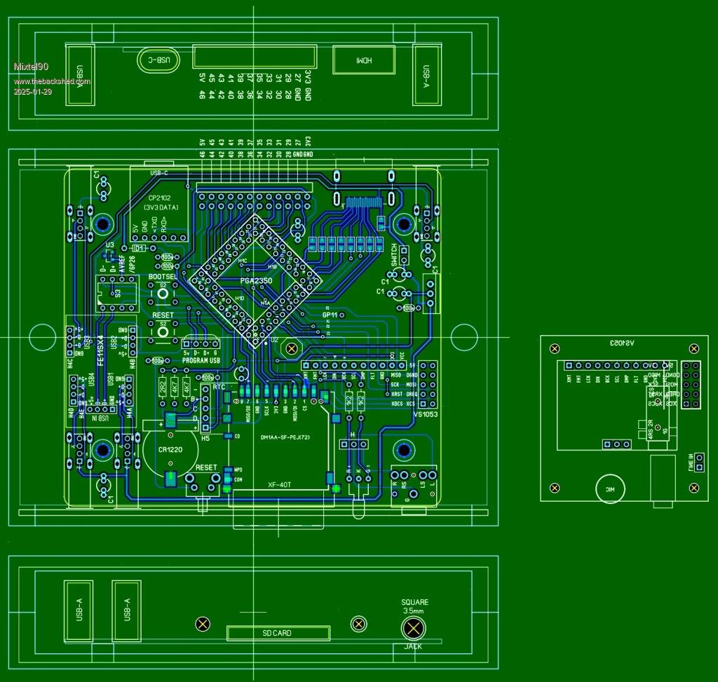 This is something that has been in development for quite a while now, ever since the PGA2350 appeared, in fact. I've kept coming back to it occasionally as it's something of a challenge. :) It's rather like a CMM 1.8. Since changing the USB-C converter for one with 3V3 signals you can even fit an on-off switch if you like. :) There are 20 GPIO pins on the rear panel and a single spare pin inside (there's not enough space for a longer connector, even though it's not a box type). The layout has been hacked about a lot since it started and is now completely re-done since it started out as my Beta design. I've now included the audio modules that I've just done for the build your own design. I think they'll work but I've not checked all the signals yet. There's still a lot of work to be done and the testing so far is only very superficial. It may be of interest to those who have a PGA2350 stuck in a drawer. Mick Zilog Inside! nascom.info for Nascom & Gemini Preliminary MMBasic docs & my PCB designs |