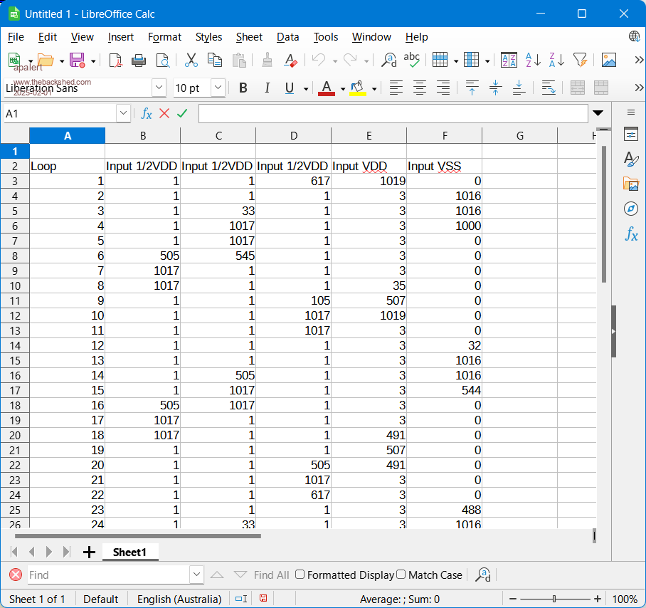 Below the code is a table of data returned. I put the code in a For x= 1 to 40 loop and ran it multiple times with 1/2VDD, VDD and VSS test voltage inputs. There is a curious pattern to the garbage!