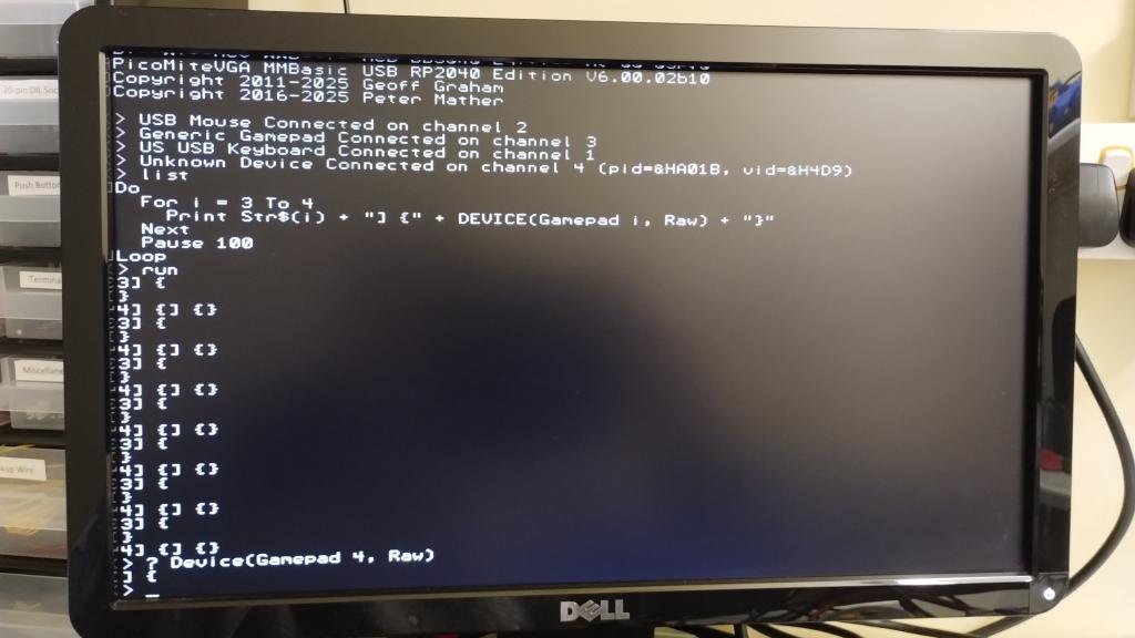 Hi WhiteWizzard, I successfully used an EasySMX PS3 Controller (2,4G Wireless), the brand still exists but the controller is not available any more. This is the thread. I needed to modify the firmware and I think these modifications are still in the current USB version. It's really messy, because at least this controller can "pose" as different gamepads and the interaction between the controller and the PicoMiteUSB is therefore a bit unpredictable ... Not a permanent solution. I also tried out other wireless controllers (including original Sony ones) but the newer ones are typically bluetooth and a BT dongle at the PicoMiteUSB does not work (at least at the time when I last tried). Best Thomas |