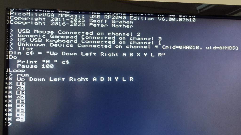 I believe that is a Bluetooth controller and not supported by PicoMite. I think that currently the PicoMiteUSB firmwares only supports wired dual-shock PS 3 & 4 controllers (may need to be official to report correct vid and pid) and a couple of random SNES lookalike USB gamepads. Best wishes, Tom Edited 2025-02-11 17:45 by thwill MMBasic for Linux, Game*Mite, CMM2 Welcome Tape, Creaky old text adventures |