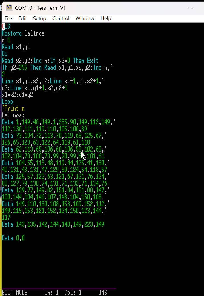 Attached is a PICO and VGA RP2040 version for test/comment. PicoMiteRP2040V6.00.02RC20e.zip PicoMiteRP2040VGAV6.00.02RC20e.zip Changes New command OPTION CONTINUATION LINES ON/OFF/ENABLE/DISABLE This is a permanent option but doesn't cause a reboot When enabled it changes behaviour as follows: The back single quote character chr$(96) is used as a line continuation when it appears as the last character on a line. The LIST command and EDIT commands will automatically insert line continuation characters when used. This will be inserted at a space or comma character if possible or at the last displayable character as defined by OPTION DISPLAY. All text in a program will therefore be viewable in the editor When in the editor you can use the line continuation character to split lines. However, on saving these effectively disappear but are recreated when the program is listed or edited. NB: They may not therefore be in the same place. When you use EDIT fname$ continuation characters are created as the file loads and then removed again when the file is saved. The way that this works is that the tokeniser effectively strips the continuation characters out of the program and joins the lines. The normal maximum line length applies. When editing/listing the saved file, the new functionality inserts the line continuation characters as described above. Example Original file CLS Restore lalinea n=1 Read x1,y1 Do Read x2,y2:Inc n:If x2=0 Then Exit If y2=255 Then Read x1,y1,x2,y2:Inc n,2 Line x1,y1,x2,y2:Line x1+1,y1,x2+1,y2:Line x1,y1+1,x2,y2+1 x1=x2:y1=y2 Loop 'Print n LaLinea: Data 1,149,46,149,1,255,90,149,112,149,112,136,111,119,110,105,106,89 Data 73,104,72,113,70,119,68,125,67,126,65,123,63,122,64,119,61,118 Data 62,113,65,106,60,106,58,102,65,102,104,78,100,73,99,70,99,65,101,61 Data 104,55,113,48,119,44,125,41,130,40,131,43,131,47,129,50,124,54,118,57 Data 125,57,122,63,121,67,121,76,124,80,127,79,130,74,131,71,132,71,134,76 Data 139,77,149,82,151,84,151,88,147,100,144,104,146,107,148,104,150,108 Data 149,110,150,108,153,109,152,112,149,115,153,121,152,124,150,123,144,117 Data 143,135,142,144,140,149,223,149 Data 0,0 As it appears in the editor with a line width of 40 characters ![]() Edited 2025-05-05 00:47 by matherp |