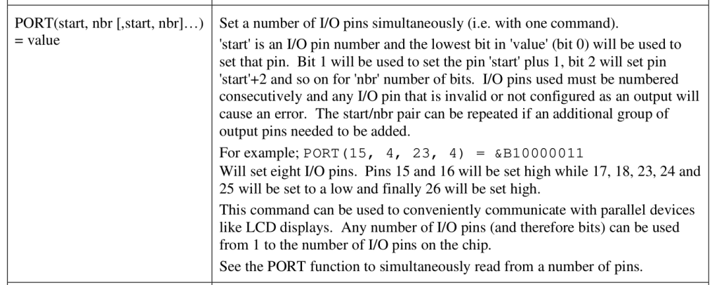 Not true - try it. The manual could use some clarification ... Not true - they are all set simultaneously in external.c : while(nbr) { if(!code)pin=codemap(pincode); else pin=pincode; // PIntComma(pin); if(IsInvalidPin(pin) || !(ExtCurrentConfig[pin] == EXT_DIG_OUT )) error("Invalid output pin"); ExtSet(pin, value & 1); value >>= 1; nbr--; pincode++; } This looks like you are walking the given map and, when a pin is valid as output then calling 'extset' with the masked value for the pin . The pins are set one by one in a loop, not as a single transfer. -edit- Apologies. i blew away my copy of the source and pulled a fresh copy from github. Looks like i had an old version . 5.7 6.x has this routine changed. So it is parallel now. Edited 2025-05-10 09:39 by vincenthimpe |