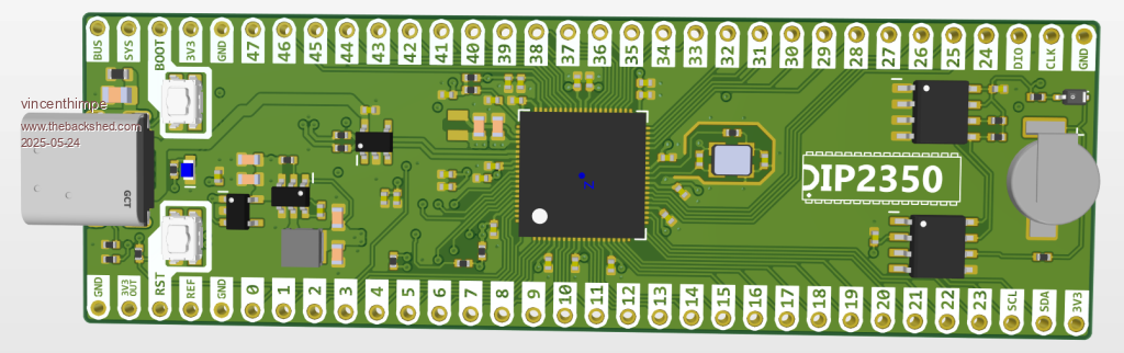 GIThub Link An RP2350 Packaged as a 64 pin DIP package. This can run MMBasic or CircuitPython or anything you want. The intended use is as a MICROCONTROLLER in an EMBEDDED application, not as a computer. Think STM32, PIC32 kind of application. Using a standard DIP64 allows simple thru-hole construction , breadboarding etc. it fits a standard 64 pin socket. No need for castellation or weird pin spacings - USB Type-C connector. Right angle , thru hole for mechanical stability. Long overhang so you can have this go through an enclosure wall. - USB powered or self powered. Self powered up to 12 volt. - Ideal diode / or-ing / e-fuse circuit (optional) to prevent backfeeding usb. - Current limit on the ideal diode. The circuit can be used as a power or-ing to provide backup power from a Li-Ion cell and charger - ESD protection on the USB port using TVS diodes - 3v3 DC/Dc regulator can deliver up to 1A of load current. In this case you need to provide 5v as USB cannot provide source current. - RP2350B in 80 pin QFN with all 48 GPIO brought out. - Flash 128Mbit - optional PSRAM on GPIO47 - optional 3v reference for analog circuitry LM4040-3 - Heartbeat led on gp25 with solder bridge. Can be removed from circuit. - Using Abracon XTAL and polarized inductor for 1v1 regulator - Boot and Reset button. Secondary boot button under usb so you can use a paperclip through the enclosure to force boot. - on board, optional i2c bus : I2C EEPROM or FRAM I2C RTC with battery backup 1220 cell. - cheap version using an M41t11 - precision using a MEMS DS3231. Option to use brown-out detection to hold cpu in reset till power stabilizes. Optional interrupt on GPIO21. User needs to wire the i2c bus to desired io port. - 4 layer board with controlled impedance and power planes. Board designed so it can be made at OshPark, JLCPCB or PCBway - CAD source available under Creative Commons ZERO . Public Domain License. Altium Format. - Production pack (gerber/drill/bom available. - BOM is procurable from Digikey/Mouser as well as LCSC (Asia) with direct LCSC order codes if you want this to be partially assembled by JLCPCB. - Pinheaders to be used are the turned pin type. Not the square Dupont style that destroys breadboards and ic sockets. Preci-Dip or equivalent. Comments welcome |