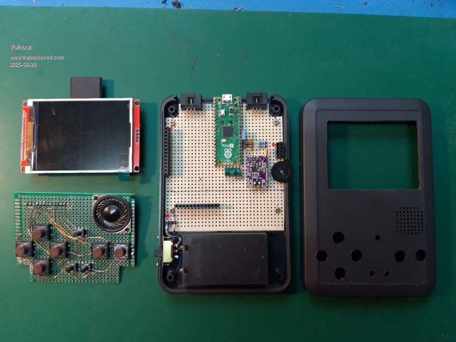 Step 1: Make a Game*Mite fit in the small robust housing. It is not too difficult. The Game*Mite consists of only few components, 3 modules (pico, charger, audio amplifier) and buttons. Just take a piece of experimenters PCB and solder few wires. Many compliments go out to Peter, who made it possible to make the SYSTEM SPI driver so robust that the wiring to SD card, LCD and TOUCH driver can be made with flying wires, no need for matched impedance traces, or good isolation. This deserves respect. Thank you Peter..