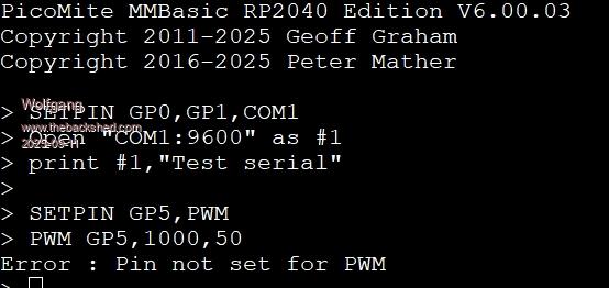 Hello user, I'm a litte bit confused, because I can't manage to generate a PWM, see listing. What am I doing wrong? ![]() The serial output is working, but PWM inputs produce an error I tried other GP-Pins too, but no success. Greets Wolfgang |