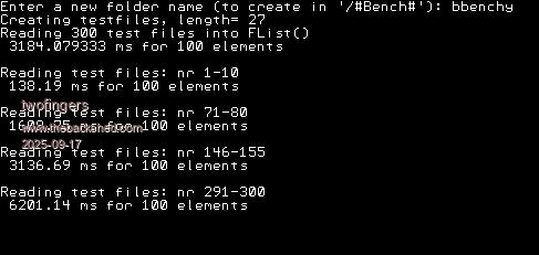 The result is that with 300 elements, the last 10 elements take 50-100 times longer to read mm.Info(MODIFIED FName$) than the first 10 elements. This is probably the main factor, but the length of the file name also has a significant influence. I tested with short names (7 characters) and long names (27 characters). The long names doubled the average read time (FDate$= mm.Info(MODIFIED FName$)), which I don't find unusual.