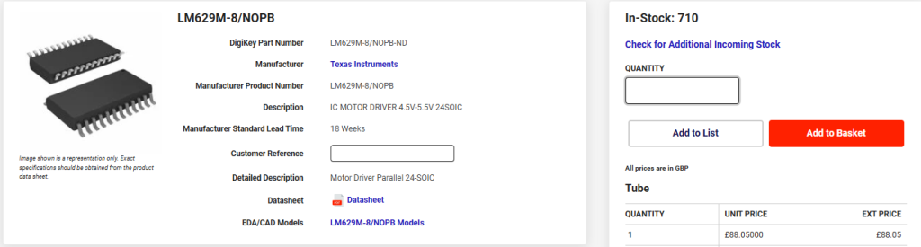 I'd like to see how that performs. I totally ignore conventional "wisdom" when I see potential. I have been looking at these ESCs with a view to closing the loop on a brushless motor. The PicoMite has PID and we are able to read encoders at high speed via PIO. There is a motion controller IC LM629, that is widely used in industrial controls but it only has 8-bit motor command (+/- 127) and is limited to 1M quadrature counts/sec. The PicoMite not only out-performs it but it has time to spare to run sequence code and of course lots of I/O. The LM629 can only generate a trapezoidal velocity profile whereas I also have s-curve (much smoother). Slight difference in price, also ![]() At the moment, I drive brush-type motors but I think I'll grab one of those ESCs and a BLM to see what I can do. Please keep us updated |