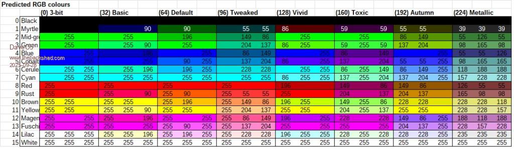 Given the imperfect ON resistance, these are the colour values measured for each of the palettes. The palette number refers to the value sent to U3's output i.e. the upper 3 bits controlling the '4066 switches.