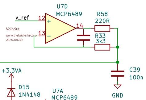 The arrangement around D16, D18 etc. is doing a couple of things. The input to R35 is essentially 0-3.3V or thereabouts, but potentially with a lot of PSU noise on it. Using  R35 to "drag" the R30 and R40 bias point up and down through the diodes both limits the voltage swing, smooths off some of the rubbish with the forward voltage curve of the diodes, and keeps the signal centred around Vsupply/2. This makes it easier to select an op-amp, as it doesn't need to support rail-rail operation. I've used an MCP6489, but I think most op-amps should work as long as they have a decent bandwidth. C36 forms an R-C filter with R35 to passively attenuate the higher-frequency components of the input signal that can cause issues for Sallen and Key filters when the op-amp phase-shift can't keep up.
