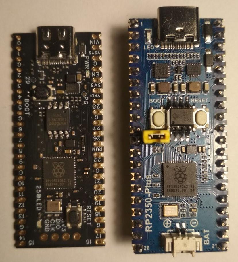 On the right in the photo is a Pico2 clone (RP2350-Plus) with a soldered PSRAM chip and a jumper for disconnecting it from the chip selection pin (CS).