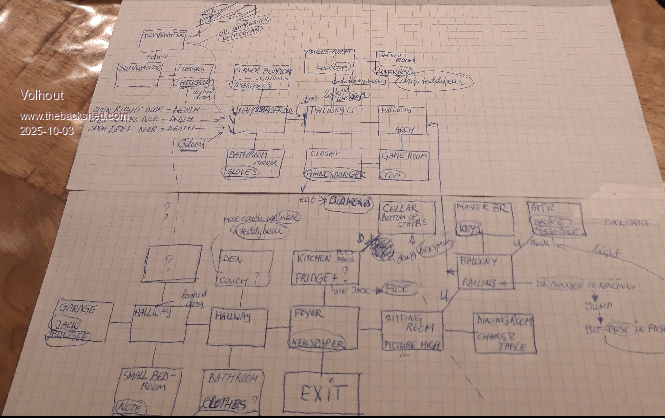 This is not the fastest method, but at the time, ball-head printers were still being used for output. So it was still relatively quick. Each room has a number, and everything belonging to that room has the same number, including the paths to other rooms. It is also not limited to one line, so there is no fixed number of paths and gimmicks. The format is very flexible. That's why you simply need to use a different map for more rooms. If no additional functions are added, the program itself does not need to be changed.