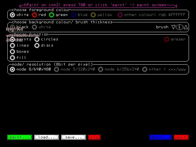 hello, because of the help from vegipede I continued to code my simple painting program. there is no real sense because there are thousends of such programms for "normal" computers and you can transform pictures via sd card to the cmm2. but i wrote for every system a paint program for fun. menu page (gui commands from geoffg): ![]() paint page: ![]() At the beginning i do not code with events for mouse etc. so the main loop runs fast and the commands "gui cursor on" and "cursor off" was called very often. i have changed this and all is well. but i think that a memory error will accure if you call this commands very often (not recursive). I tested it with a little program: dim integer n=0 cls do inc n gui cursor on print @(0,0)n gui cursor off loop and after 879 loops the system says kind of "not enough internal memory". i use a cmm2 g2 v2. is this a bug/ correct? or have I a mistaken thinking? |