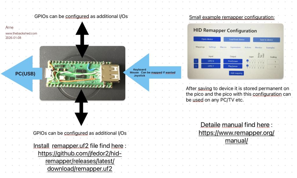 Hello Bill, To do the things you wanted MMBasic is not needed. Do it directly with HID-remapper: - solder 4 lines to the pico (see also manual/picture) - install remapper.uf2 on the pico (e.g. rp2040 version) - connect switches/LEDs etc. to the relevant GPIOs (e.g. to make your own controller) - configure via browser - save configuration permanent to pico Thats it. The hardware can be used on PC/ Mac/Picomite etc. Here a short overview to have an idea: ![]() Have fun Arne |