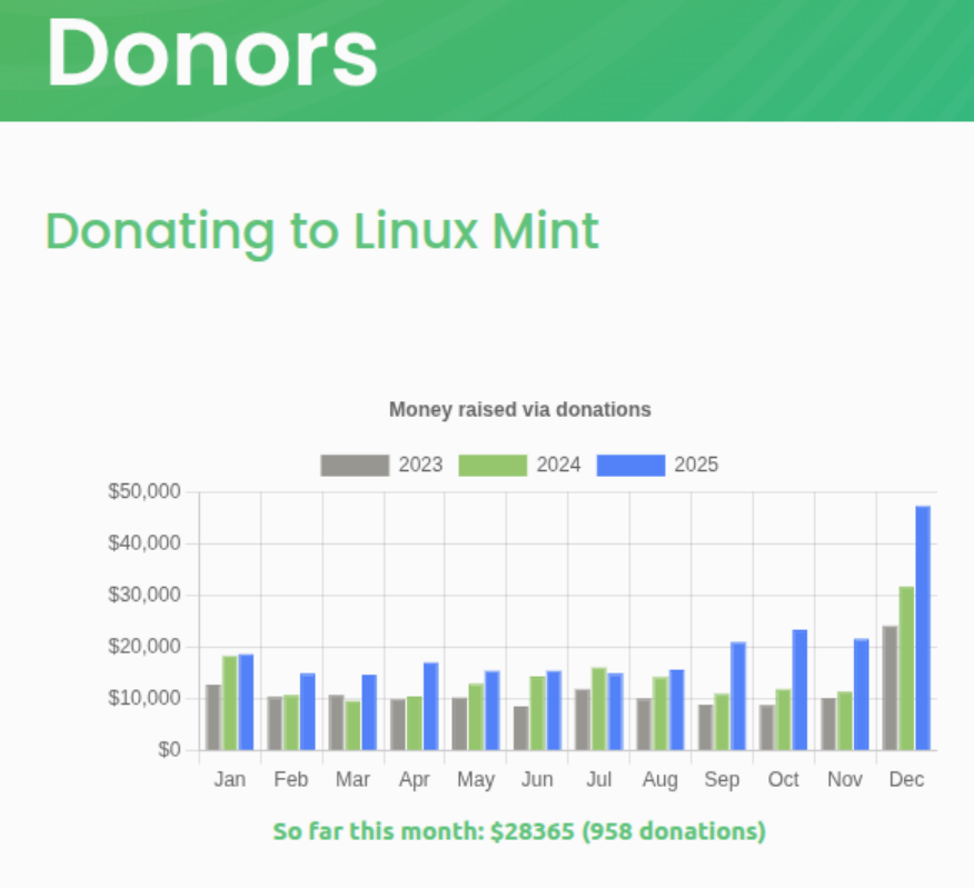 Note that donations to Linux Mint were up, right from about the time that W10 support ended, but it just skyrocketed in December!