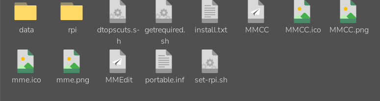 made mmedit folder in home  and cut/pasted mmedi.zip to it then extracted here then extracted mmedit5.tar.gz and mmedt5 folder. This has mmcc icon and mmedit icon and set-rpi.sh and rpi folder with mmcc and mmedit.