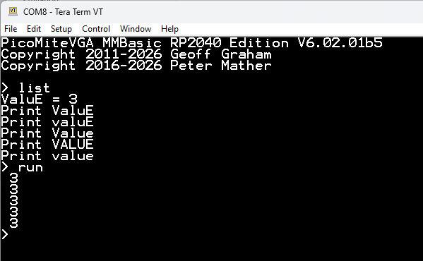 I am using MM Basic  user manual version Ver 5.07.04 which states that the interpreter is not CASE sensitive but I found otherwise recently.  I usually use capitals for all program names subroutines values etc and lower case for the rest. I downloaded a set of routines lately that had a mixture of cases that refused to run. I found after battling the error messages that a variable must be identical letter for letter to the definition.
