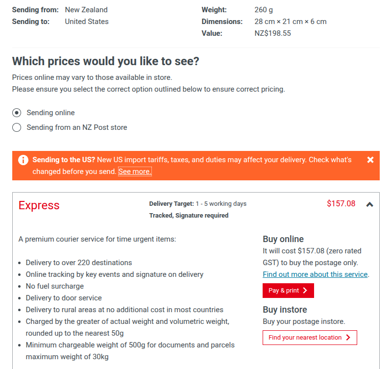 New Zealand Post: For up to 1 kg, Economy costs around 29 NZ