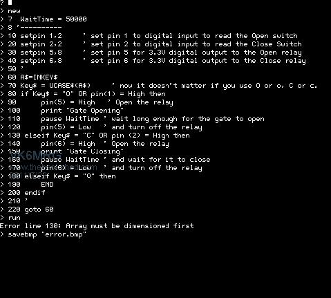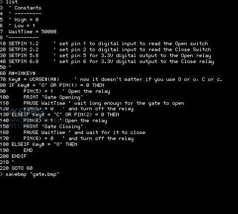 20 low = 1 30 ' 32 ' 34 ' setpin 1,2 ' set pin 1 to digital input to read the Open switch 36 ' setpin 2,2 ' set pin 2 to digital input to read the Close Switch 38 setpin 5,8 ' set pin 5 for 3.3V digital output to the Open relay 40 setpin 6,8 ' set pin 6 for 3.3V digital output to the Close relay 42 ' setpin 3,2 ' software open limit 44 ' setpin 4,2 ' software closed limit 50 CLS 60 input A$ 62 if A$ = "Q" then goto 210 63 if A$ = "q" then goto 210 64 if A$ = "O" then goto 100 66 if A$ = "o" then goto 100 68 if A$ = "C" then goto 150 70 if A$ = "c" then goto 150 'yes i know it's a bit long, but it works! 72 goto 50 100 pin(5) = 1 ' turns on pin(5) drives the relay 102 print "Gate Opening" 104 pause 50000 ' wait long enough for the gate to open 106 pin(5) = 0 ' resets pin(5) = 0 and turns off the relay 108 goto 50 150 pin(6) = 1 ' turns on pin(6) drives the relay 152 print "Gate Closing" 154 pause 50000 ' and wait for it to close 156 pin(6) = 0 ' resets pin(6) = 0 and turns off the relay 158 goto 50 180 ' 200 ' 210 end Next i will tackle the switch inputs. Its easier to ask forgiveness than to seek permission! ............VK6MRG.............VK3MGR............ |