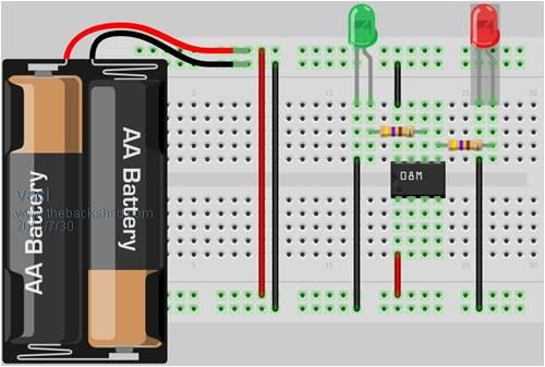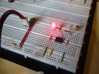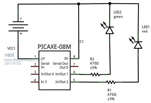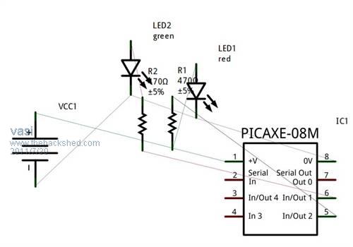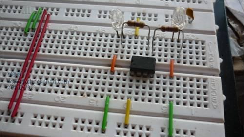 The best way in getting familiar with it, is to start a little project. So, I started blinking two LEDs with a PICAXE 08M and this is how it looks on the breadboard: