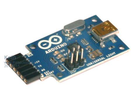 This board converts a USB connection into 5 volt TX and RX that you can connect straight to the Arduino Mini or other microcontrollers, allowing them to talk to the computer.