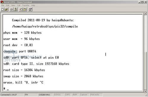 This is a port of RetroBSD which was announced only 10 days before I had it working. The author Serge Vakulenko worked on it for a year in his spare time and posted the announcement on 6 Aug to the MIPS Developer website. He's running a UBW32 board but he has a Maximite on order too. :-)