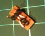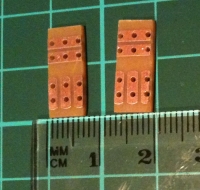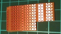 The next bit involves soldering header pins onto the board. The three pins going into the "vertical" strips at the edge of the board need to be soldered over the wire "whiskers" from the previous step. The pins will only just protrude through the board so thay can be soldered. Two pins are also soldered into the "horizontal" strips in the centre holes. More fuzzy, small images follow: