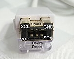 Almost done. The last bit is a little tricky... The protruding whiskers need to be squeezed into the tiny holes above the slot on the Wii socket. As the board is pushed into the slot, small springy metal tabs move up into these holes and so hold the wires in place. The trick is to get the wires in first before the board wedges the springy metal bits up too hard to get the wires into the gap. It may help to cut the wires to the right length (about the end of the board) and then very carefully, with *sharp* wire cutters, give the wires a chisel edge by cutting them diagonally at the end. It is important that the wires go into the two holes on the Wii socket where the middle connector is Unused, i.e. SCL & GND (image below borrowed from the WiiBrew wiki) and the edge connector part of the board connects to the VCC and SDA lines. The middle of these connections is of no importance to us: