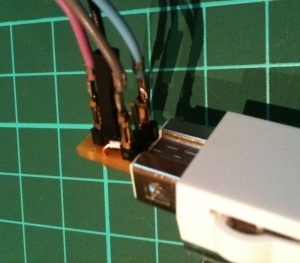 Cut the board so that you have three strips (vertical) at the edge and a couple of horizontal strips. A little bit of sanding and trial (avoid error) and you can get a little board that fits snugly into the Wii socket. The width is about 6mm, but it's best to start a bit wider and sand slightly until the fit is just right. See below: