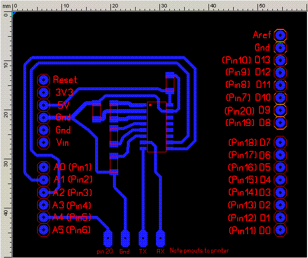 Hi vasi, There is a breakout shield board that connects to the 26 pin connector too if you didn't know. I've just designed up a RS232E shield board to use for my printer project as I don't want to risk the onboard RS232 chip. I'll be tranferring the pcb image via my usual method of the iron on as I have found it gives far better results than 2 copies stuck together and doing the UV method. Anyway if any other guys are using Sprint Layout for pcb design that Adruino pinout is saved as a macro and I'll be happy to share it if anyone wants it. Regards Bryan |