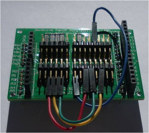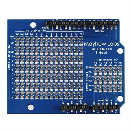 When I first heard about Dontronics DonDuino Patch board for Arduino connections I frankly didn't get it. I usually just modify code or modify in a different way. Then I started to realize this could be a handy additional shield to own. I'm a bit slow at times. Apparently others figured it out also as there is now another shield doing the same thing called the Go-Between shield in a surface mount way. I think the DonDuino patch has more options like connecting an analog pin to a digital pin but its nice to have shield options. I do like the way they used surface mount connecters on this new design. I think this technique could create even more interesting adapter shields. Don and company were ahead of the curve. DonDuino Patch