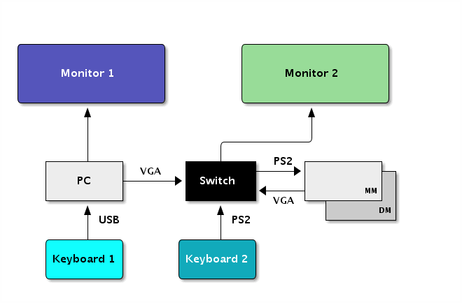 Having three monitors and two keyboards on my desktop is just taking up too much valuable space... I use a dual monitor setup for my PC and one for the Maximite (two keyboards, one USB the other PS2 for the Maximite). I also have a Duinomite which I have only been connecting to via TeraTerm from the PC. While TeraTerm is great, the loss of graphics capability is sometimes a pain. Some years ago it was quite common to find Switches that would allow one Keyboard/Mouse/Monitor setup to be control various PC's by selecting a switch (usually up to four machines), but as remore desktop software became more popular the need for physical switches has diminished. I was wondering if anybody has faced and solved a similar issue? There are manual switches like the one at the bottom of this page - which look like they come from the early 90's! I am thinking of this type of setup which should still allow me to use the second monitor for the PC when required as well as switch over to the MM and DM as well as switching between them...
