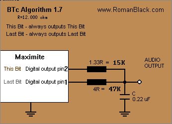 I used 1.7 because the algorithm 'is the best speed on Maximite. See BTC Sound Compression Algorithm http://www.romanblack.com/btc_alg.htm I used two resistors and a capacitor to pins 1 and 2 of Maximite. Something feels ....
