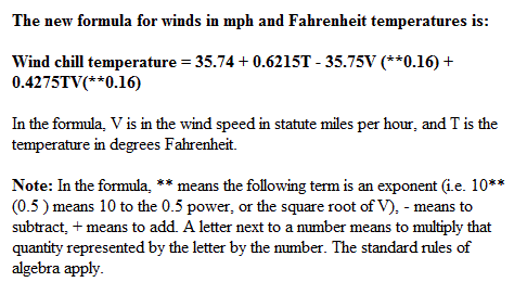 I have been trying to figure out how to enter this formula in MM Basic. It calculates Wind Chill from the temp(F) and wind speed(mph). I have been trying for a couple of days now but my numbers are way off. The part I don't understand is the fractional exponent. Any help would be appreciated.