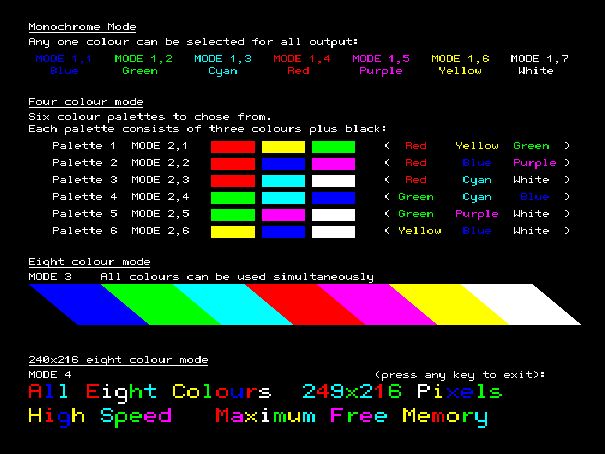 Note that when you change modes the whole screen changes, this demo was fudged with the screen in MODE 3