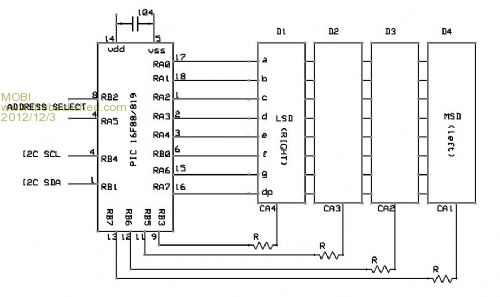 Hi Mick, It is a standard 2wire i2c set up. The two address lines (RB2 and RA5) are hardware jumper select (hi or low) to give up to 4 addresses. That means you can have a display up to 16 digits. The module keeps on displaying the last code sent to it until changed with another i2c write. When I post the source code, you will see each digit is polled for a few milisecs in a never ending loop until the data is changed by the i2c interrupt. If I use the picf819 version, it is even cheaper. All 4 didits can be written to at once (the ususal way) or individually david m. David M. |
