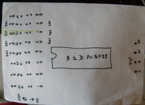 Here is an addition to my picf88 i2c modules. This is a 7 channel 10 bit adc module. Should be suitable for battery monitoring etc. It is not continuous read, rather you send the channel you want to read and then read the data on the i2c. I've found it plenty "real time" enough for most purposes. Don't know if anyone out there is using i2c on TBS or not but here goes anyway. It is easy enough to drive, just send the channel (1 to 7) out on the control byte and then read the 10 bit code (bytes 0 and 1) - see the zip file attached. The module is suitable for bread boarding or vero board. The example shown has a 12 battery across a 10k pot (for variable voltage) and a couple of resistors as a voltage divider to give me reasonable resolution around 0.01 volt/step in the 0 to 50 volt range. Sorry the pinout sketch is a bit amateurish but I'll do up a proper schematic later. I use this board as i2c master and various other slave functions from time to time. Hex file to programme F88 is in zip file as well as picaxe i2c example. 2012-12-09_093658_i2c_adc.zip David M. |