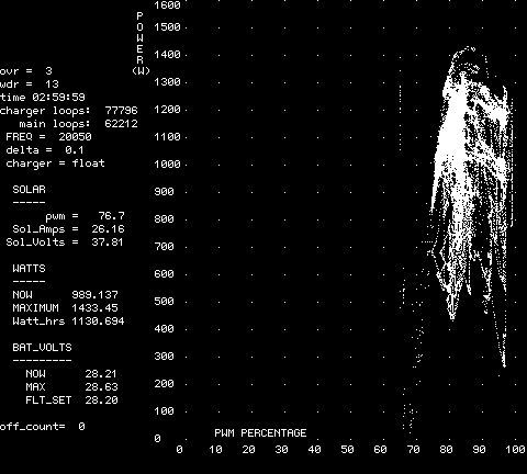The software displays the input current and voltage and the battery voltage. It also plots the pwm duty cycle on the horzontal axis and power on the vertical. This allows you to watch the tracking process as it jitters either side of the best operating point.