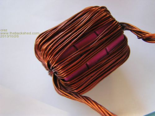 They are stacked together. The winding consists of 18 turns of 7 strands of 1.2mm enamelled copper wire. The strands are loosely bunched together and then wound onto the three cores, pulling tight on each turn. The inductance at low current reads more like 200uH, but at high current magnetic saturation of the core reduces the actual inductance down towards 100uH.