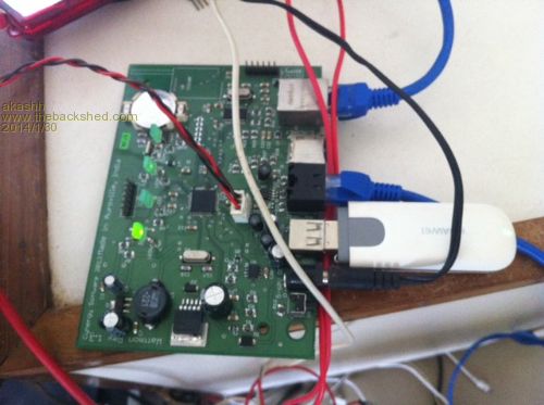 Here is a picture of the Wattmon board with USB dongle plugged in an connected to the Internet. The RTC and battery backup keeps track of time. The HV power supply can be seen at one end. microSD, modbus port (RJ45), Ethernet and USB are all along one edge.