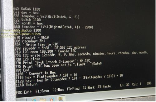 And in case you want to set it SetDS1307: ' Get time from time$ and date$ tempdec = val(left$(time$, 2)) DECtoBCD tempdec hours = hex tempdec = val(mid$(time$, 4, 2)) DECtoBCD tempdec minutes = hex tempdec = val(right$(time$, 2)) DECtoBCD tempdec seconds = hex tempdec = val(left$(date$, 2)) DECtoBCD tempdec day = hex tempdec = val(mid$(date$, 4, 2)) DECtoBCD tempdec month = hex tempdec = (val(right$(date$, 4)) - 2000) DECtoBCD tempdec year = hex rtcctrl = &h10 rtcwday= &h1 ' Write Time to RTC i2caddr = &h68 ' DS1307 I2C address i2c open 100,100 ' Enable I2C i2c Write i2caddr, 0, 9, &h0, seconds, minutes, hours, rtcwday, day, month, year, rtcctrl i2c Close ? "0=ok 1=nack 2=timeout"; mm.i2c ? "RTC has been set to ";time$;" ";date$ end ' Convert to Hex Sub DECtoBCD (tempdec) hex = fix(tempdec / 10) * 16 hex = hex OR ((tempdec / 10) - (fix(tempdec / 10))) * 10 End Sub And a little Picture of it going