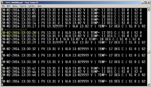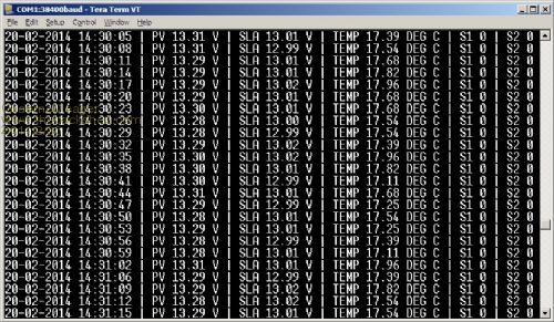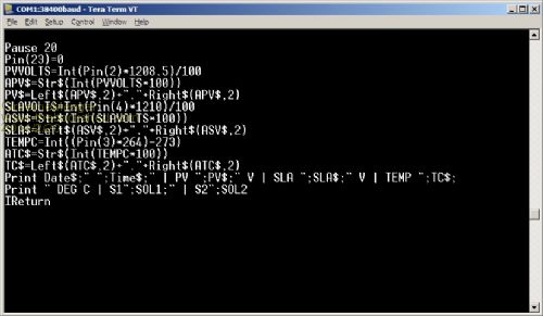 Print Date$;" ";Time$;" | PV ";PV$;" V | SLA ";SLA$;" V | TEMP ";TC$;