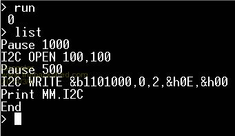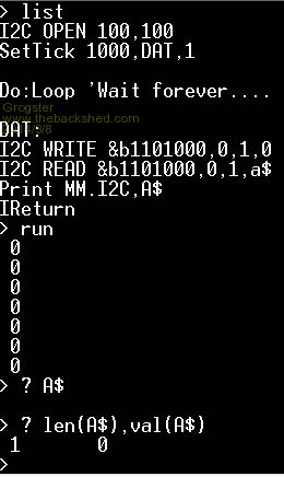 If we want to read the seconds data, we first have to write a start address of zero. Subsequent reads will read from the next address (minutes) etc. MaxiMite allowed us to specify the start address as part of the read routine, but not in uMite.