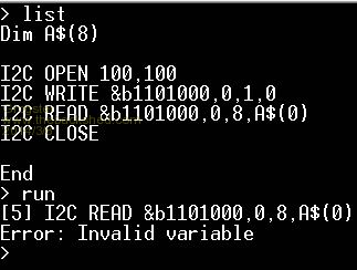 To do anything on the i2c bus, you first must activate or open the i2c function. You do this by the command i2c open,100,100. Never mind the reason for now, just use it.